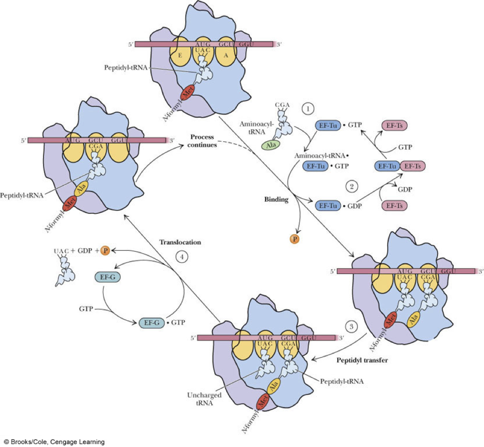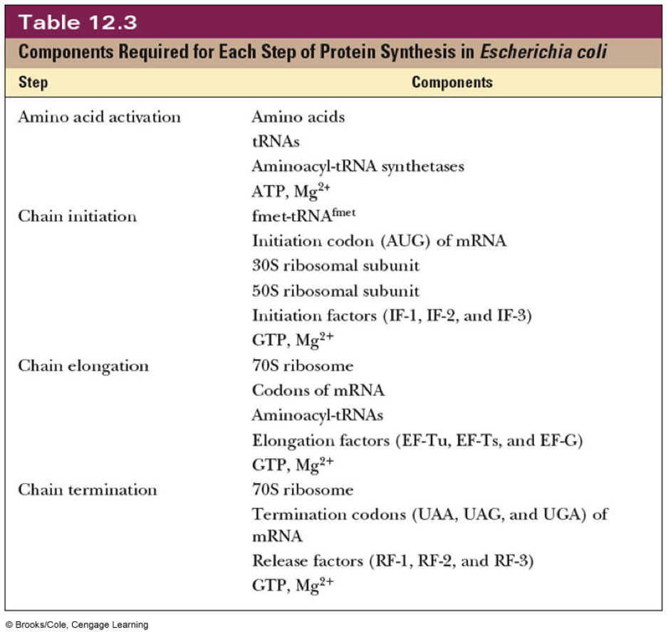 - Requires * 70S ribosome * codons of mRNA * aminoacyl-tRNAs * elongation factors EF-Tu (Elongation factor temperature-unstable), EF-Ts (Elongation factor temperature-stable), and EF-G (Elongation factor-GTP) * GTP, and Mg2+