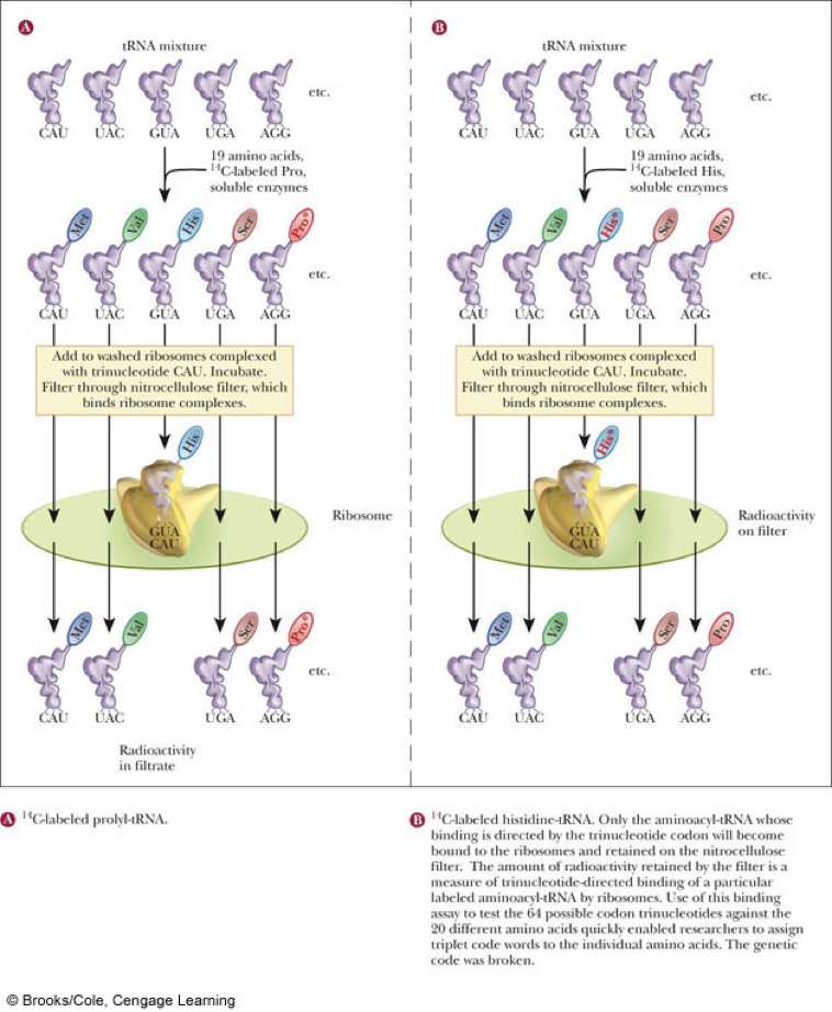 - Assignments of triplets in genetic code based on several different experiments * synthetic mRNA: if mRNA is polyU, polyPhe is formed; if mRNA is poly ---ACACACACACACACACACACA---, poly(Thr-His) is formed * binding assay: aminoacyl-tRNAs bind to ribosomes in the presence of trinucleotides * synthesize trinucleotides by chemical means * carry out a binding assay for each type of trinucleotide * aminoacyl-tRNAs are tested for their ability to bind in the presence of a given trinucleotide * The Filter-Binding Assay Helps Elucidate the Genetic Code