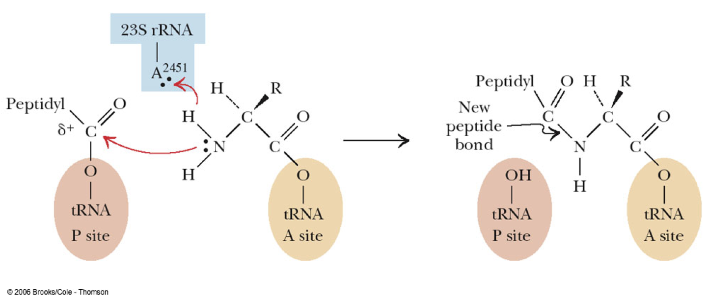 - Facilitated by a purine moiety of rRNA abstracting a proton