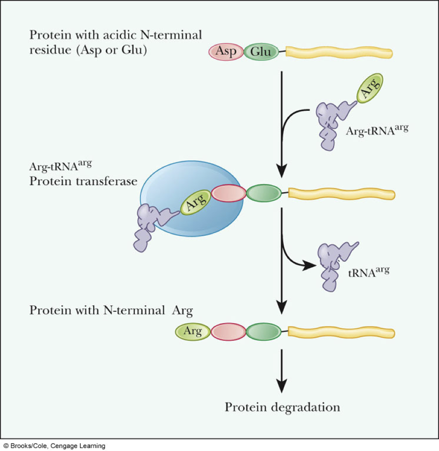 - In eukaryotes, ubiquitinylation (becoming bonded to ubiquitin) targets a protein for destruction * those with an N-terminus of Met, Ser, Ala, Thr, Val, Gly, and Cys are resistant * those with an N-terminus of Arg, Lys, His, Phe, Tyr, Trp, Leu, Asn, Gln, Asp, Glu have short half-lives