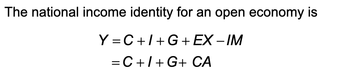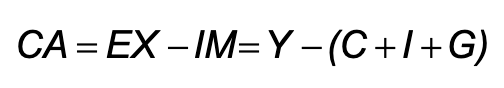 National saving (S) — domestic investment (I) = the current account (CA)(≈ exports minus imports).
