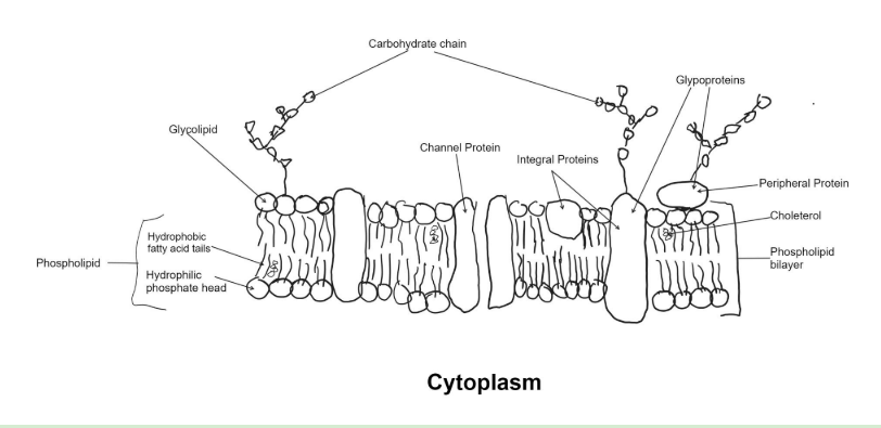 Cholesterol - sits between the tail of the phospolipids, is important in the cell membrane, connect phospholipds by stabilizing the membrane structure and influencing its fluidity, allowing it to remain flexible under varying temperatures. Additionally, membrane proteins play a vital role in transport processes, acting as channels or carriers that enable specific substances to cross the membrane more efficiently.