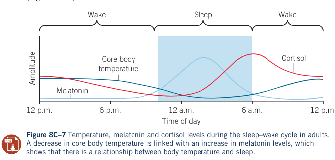 - Increase in melatonin coincides with decrease in core body temperature leading to sleep onset.