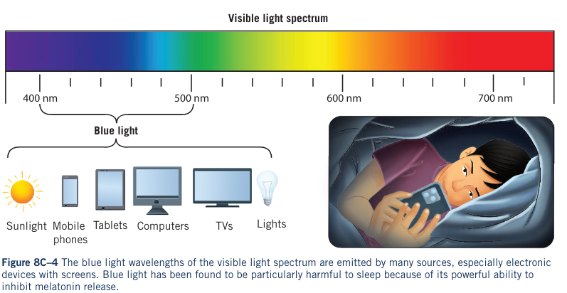 - Blue light inhibits melatonin, affecting sleep quality and quantity.