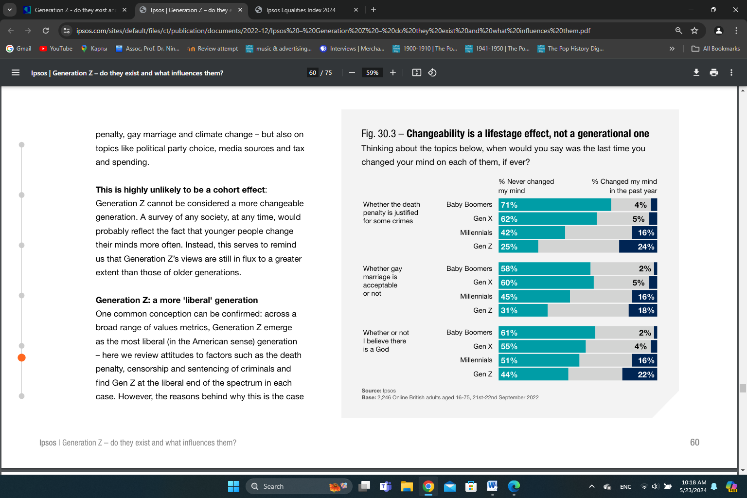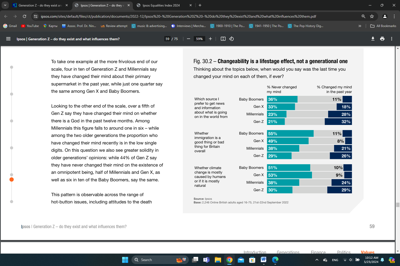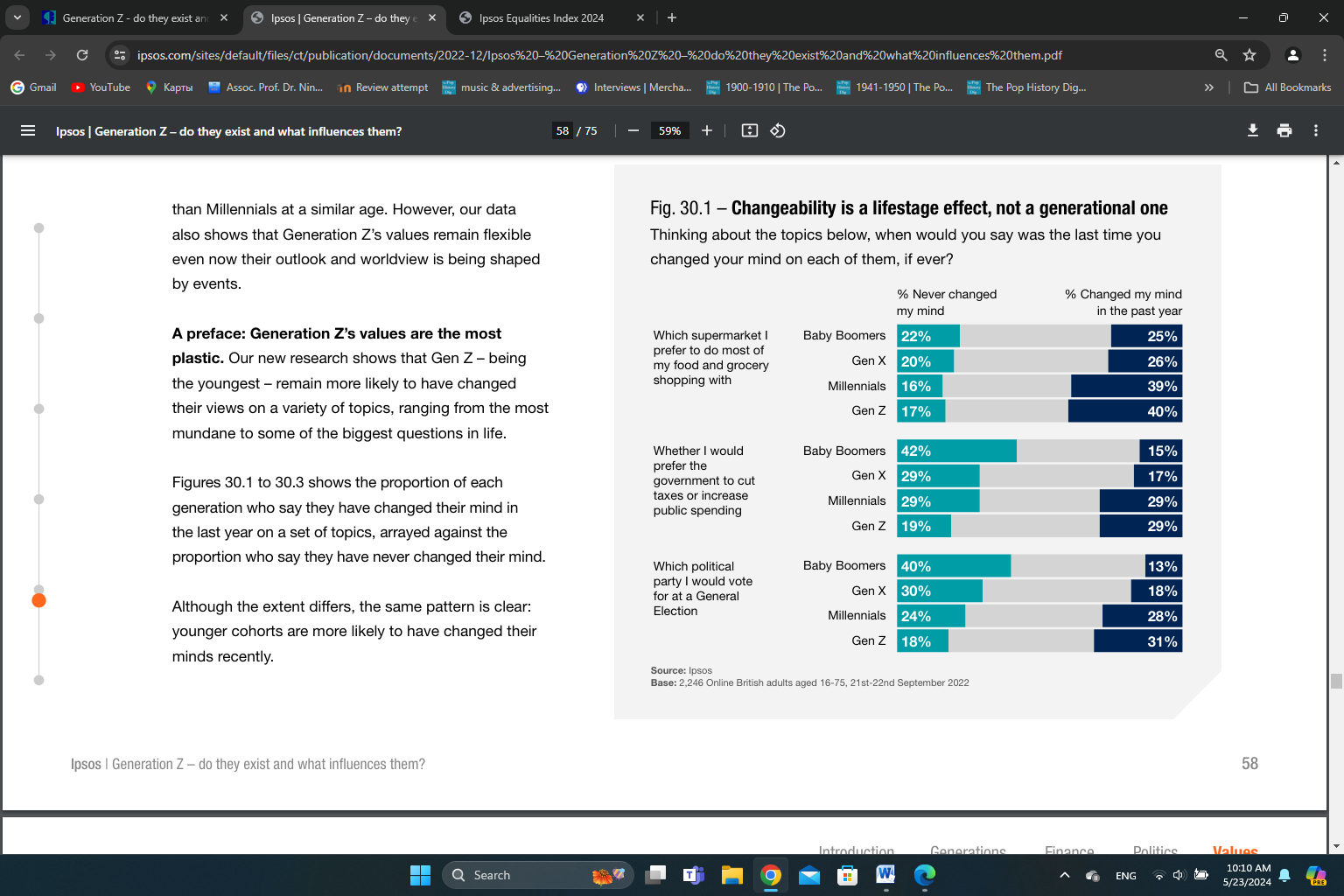 Generation Z’s values are the most plastic. This new research shows that Gen Z – being the youngest – remain more likely to have changed their views on a variety of topics, ranging from the most mundane to some of the biggest questions in life. Figures 30.1 to 30.3 shows the proportion of each generation who say they have changed their mind in the last year on a set of topics, arrayed against the proportion who say they have never changed their mind.