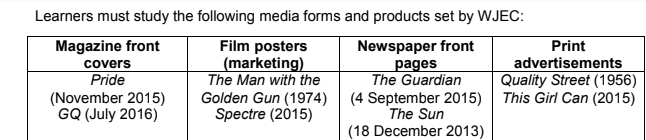 You will be expected to analyse media language and representation in the following forms: magazines, newspapers, marketing (film posters) or print advertisements.