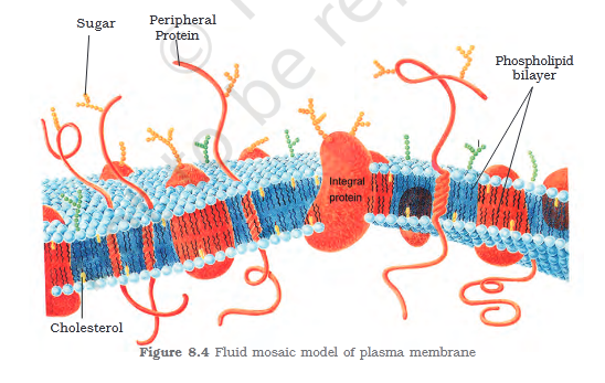 An improved model of the structure of cell membrane was proposed by Singer and Nicolson (1972) widely accepted as fluid mosaic model (Figure 8.4). According to this, the quasi-fluid nature of lipid enables lateral movement of proteins within the overall bilayer. This ability to move \n within the membrane is measured as its fluidity. \n The fluid nature of the membrane is also important from the point of view of functions like cell growth, formation of intercellular junctions, secretion, endocytosis, cell division etc. \n One of the most important functions of the plasma membrane is the transport of the molecules across it. The membrane is selectively permeable to some molecules present on either side of it. Many molecules can move briefly across the membrane without any requirement of energy and this \n is called the passive transport. Neutral solutes may move across the membrane by the process of simple diffusion along the concentrationgradient, i.e., from higher concentration to the lower. Water may also moveacross this membrane from higher to lower concentration. Movement of \n water by diffusion is called osmosis. As the polar molecules cannot pass through the nonpolar lipid bilayer, they require a carrier protein of the membrane to facilitate their transport across the membrane. A few ions or molecules are transported across the membrane against their \n concentration gradient, i.e., from lower to the higher concentration. Such a transport is an energy dependent process, in which ATP is utilised and is called active transport, e.g., Na+/K+ Pump. \n