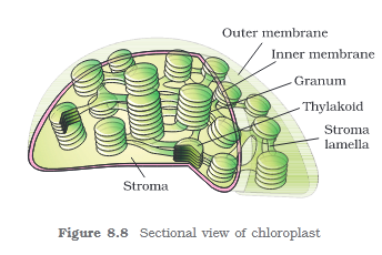 Plastids are found in all plant cells and in euglenoides. These are easily observed under the microscope as they are large. They bear some specific pigments, thus imparting specific colours to the plants. Based on the type of pigments plastids can be classified into chloroplasts, \n chromoplasts and leucoplasts. \n The chloroplasts contain chlorophyll and carotenoid pigments which are responsible for trapping light energy essential for photosynthesis. In the chromoplasts fat soluble carotenoid pigments like carotene, xanthophylls and others are present. This gives the part of the plant a yellow, orange or red colour. The leucoplasts are the colourless plastids of varied shapes and sizes with stored nutrients: Amyloplasts store carbohydrates (starch), e.g., potato;elaioplasts store oils and fats whereas the aleuroplasts store proteins. \n Majority of the chloroplasts of the green plants are found in the mesophyll cells of the leaves. These are lens-shaped, oval, spherical, discoid or even ribbon-like organelles having variable length (5-10μm) and width (2-4μm). Their number varies from 1 per cell of the Chlamydomonas, a green alga to 20-40 per cell in the mesophyll. \n Like mitochondria, the chloroplasts are also double membrane bound. Of the two, the inner chloroplast membrane is relatively less permeable. The space limited by the inner membrane of the chloroplast is called the stroma. A number of organised flattened membranous sacs called the thylakoids, are present in the stroma (Figure 8.8). Thylakoids are arranged in stacks like the piles of coins called grana (singular: granum) or the intergranal thylakoids. In addition, there are flat membranous tubules called the stroma lamellae connecting the thylakoids of the different grana. The membrane of the thylakoids enclose a space called a lumen. The stroma of the chloroplast contains enzymes required for the synthesis of carbohydrates and proteins. It also contains small, double- stranded circular DNA molecules and ribosomes. Chlorophyll pigments are present in the thylakoids. The ribosomes of the chloroplasts are smaller (70S) than the cytoplasmic ribosomes (80S).