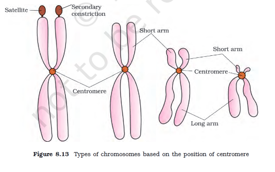 The metacentric chromosome has middle centromere forming two equal arms of the chromosome. The sub-metacentric chromosome has centromere slightly away from the middle of the chromosome resulting into one shorter arm and one longer arm. In case of acrocentric chromosome the centromere is situated close to its end forming one extremely short and one very long arm, whereas the telocentric chromosome has a terminal centromere.