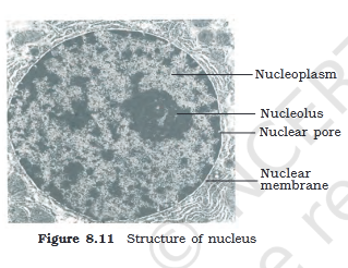 Nucleus as a cell organelle was first described by Robert Brown as early as 1831. Later the material of the nucleus stained by the basic dyes was given the name chromatin by Flemming. \n The interphase nucleus (nucleus of a cell when it is not dividing) has highly extended and elaborate nucleoprotein fibres called chromatin, nuclear matrix and one or more spherical bodies called nucleoli (sing.: nucleolus) (Figure 8.11). \n Electron microscopy has revealed that the nuclear envelope, which consists of two parallel membranes with a space between (10 to 50 nm) called the perinuclear space, forms a barrier between the materials present inside the nucleus and that of the cytoplasm. The outer membrane usually remains continuous with the endoplasmic reticulum and also bears ribosomes on it. At a number of places the nuclear envelope is interrupted by minute pores, which are formed by the fusion of its two membranes. These nuclear pores are the passages through which movement of RNA and protein molecules takes place in both directions between the nucleus and the cytoplasm. Normally, there is only one nucleus per cell, variations in the number of nuclei are also frequently observed. Can you recollect names of organisms that have more than one nucleus per cell? Some mature cells even lack \n nucleus, e.g., erythrocytes of many mammals and sieve tube cells of vascular plants. Would you consider these cells as ‘living’? \n The nuclear matrix or the nucleoplasm contains nucleolus and chromatin. The nucleoli are spherical structures present in the nucleoplasm. The content of nucleolus is continuous with the rest of the nucleoplasm as it is not a membrane bound structure. It is a site for active ribosomal RNA synthesis. Larger and more numerous nucleoli are present in cells actively carrying out protein synthesis.