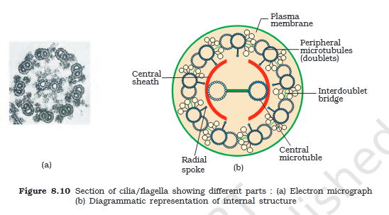 Cilia (sing.: cilium) and flagella (sing.: flagellum) are hair-like outgrowths of the cell membrane. Cilia are small structures which work like oars, causing the movement of either the cell or the surrounding fluid. Flagella are comparatively longer and responsible for cell movement. The prokaryotic bacteria also possess flagella but these are structurally different from that of the eukaryotic flagella. \n The electron microscopic study of a cilium or the flagellum show that they are covered with plasma membrane. Their core called theaxoneme, possesses a number of microtubules running parallel to the long axis. \n The axoneme usually has nine doublets of radially arranged peripheral microtubules, and a pair of centrally located microtubules. Such an arrangement of axonemal microtubules is referred to as the 9+2 array (Figure 8.10). The central tubules are connected by bridges and is also enclosed by a central sheath, which is connected to one of the tubules of each peripheral doublets by a radial spoke. Thus, there are nine radial spokes. The peripheral doublets are also interconnected by linkers. Both the cilium and flagellum emerge from centriole-like structure called the basal bodies.