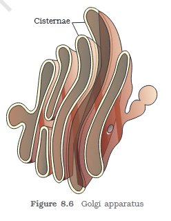 Camillo Golgi (1898) first observed densely stained reticular structures near the nucleus. These were \n later named Golgi bodies after him. They consist of many flat, disc-shaped sacs or cisternae of \n 0.5μm to 1.0μm diameter (Figure 8.6). These are stacked parallel to each other. Varied number of \n cisternae are present in a Golgi complex. The Golgi cisternae are concentrically arranged near the \n nucleus with distinct convex cis or the forming face and concave trans or the maturing face. \n The cis and the trans faces of the organelle are entirely different, but interconnected. \n The golgi apparatus principally performs the function of packaging materials, to be delivered either to the intra-cellular targets or secreted outside the cell. Materials to be packaged in the form of vesicles from the ER fuse with the cis face of the golgi apparatus and move towards the maturing face. This explains, why the golgi apparatus remains in close association with the endoplasmic reticulum. A number of proteins synthesised by ribosomes on the endoplasmic reticulum are modified in the cisternae of the golgi apparatus before they are released from its trans face. Golgi apparatus is the important site of formation of glycoproteins and glycolipids. \n