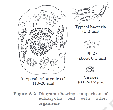 The prokaryotic cells are represented by bacteria, blue-green algae, mycoplasma and PPLO (Pleuro Pneumonia Like Organisms). They are generally smaller and multiply more rapidly than the eukaryotic cells (Figure 8.2). They may vary greatly in shape and size. The four basic shapes of bacteria are bacillus (rod like), coccus (spherical), vibrio (comma shaped) and spirillum (spiral).