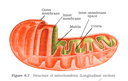 Mitochondria (sing.: mitochondrion), unless specifically stained, are not easily visible under the microscope. The number of mitochondria per cell is variable depending on the physiologicalactivity of the cells. In terms of shape and size also, considerable degree of variability is observed. Typically \n it is sausage-shaped or cylindrical having a diameter of 0.2-1.0μm (average 0.5μm) and length 1.0-4.1 μm. Each mitochondrion is a double membrane-bound structure with the outer membrane and the inner membrane dividing its lumen distinctly into two aqueous compartments, \n i.e., the outer compartment and the inner compartment. The inner compartment is filled with a dense homogeneous substance called the matrix. The outer membrane forms the continuous limiting boundary of the organelle. The inner membrane forms a number of infoldings called the cristae (sing.: crista) towards the matrix (Figure 8.7). The cristae increase the surface area. The two membranes have their own specific enzymes associated with the mitochondrial function. Mitochondria are \n the sites of aerobic respiration. They produce cellular energy in the form of ATP, hence they are called ‘power houses’ of the cell. The matrix also possesses single circular DNA molecule, a few RNA molecules, ribosomes (70S) and the components required for the synthesis of proteins. The \n mitochondria divide by fission.