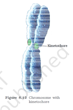You may recall that the interphase nucleus has a loose and indistinct network of nucleoprotein fibres called chromatin. But during different stages of cell division, cells show structured chromosomes in place of the nucleus. \n Chromatin contains DNA and some basic proteins called histones, some non-histone proteins and also RNA. A single human cell has approximately two metre long \n thread of DNA distributed among its forty six (twenty three pairs) chromosomes. You will study the details of DNA packaging in the form of a chromosome in class XII. \n Every chromosome (visible only in dividing cells) essentially has a primary constriction or thecentromere on the sides of which disc shaped structures called kinetochores are present (Figure 8.12). Centromere holds two chromatids of a chromosome. Based on the position \n of the centromere, the chromosomes can be classified into four types (Figure 8.13).
