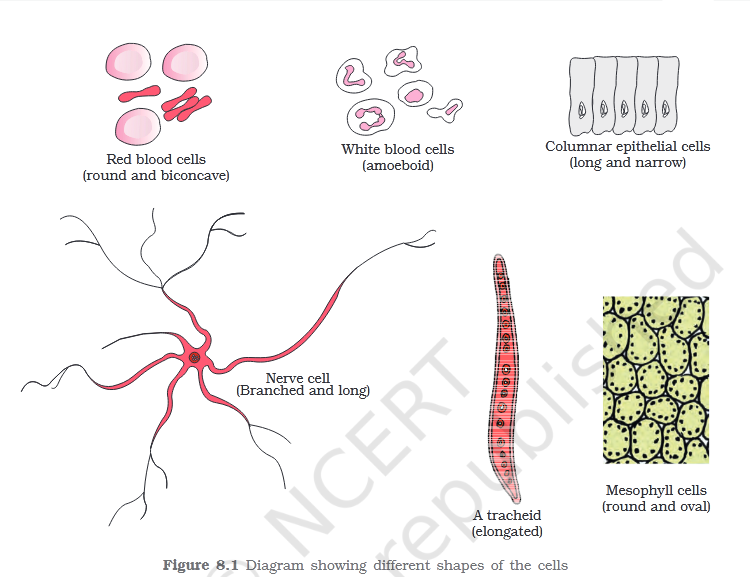 Cells differ greatly in size, shape and activities (Figure 8.1). For example, Mycoplasmas, the smallest cells, are only 0.3μm in length while bacteria could be 3 to 5μm. The largest isolated single cell is the egg of an ostrich. \n Among multicellular organisms, human red blood cells are about 7.0 μm in diameter. Nerve cells are some of the longest cells. Cells also vary greatly in their shape. They may be disc-like, polygonal, columnar, cuboid, thread like, or even irregular. The shape of the cell may vary with the function they perform.