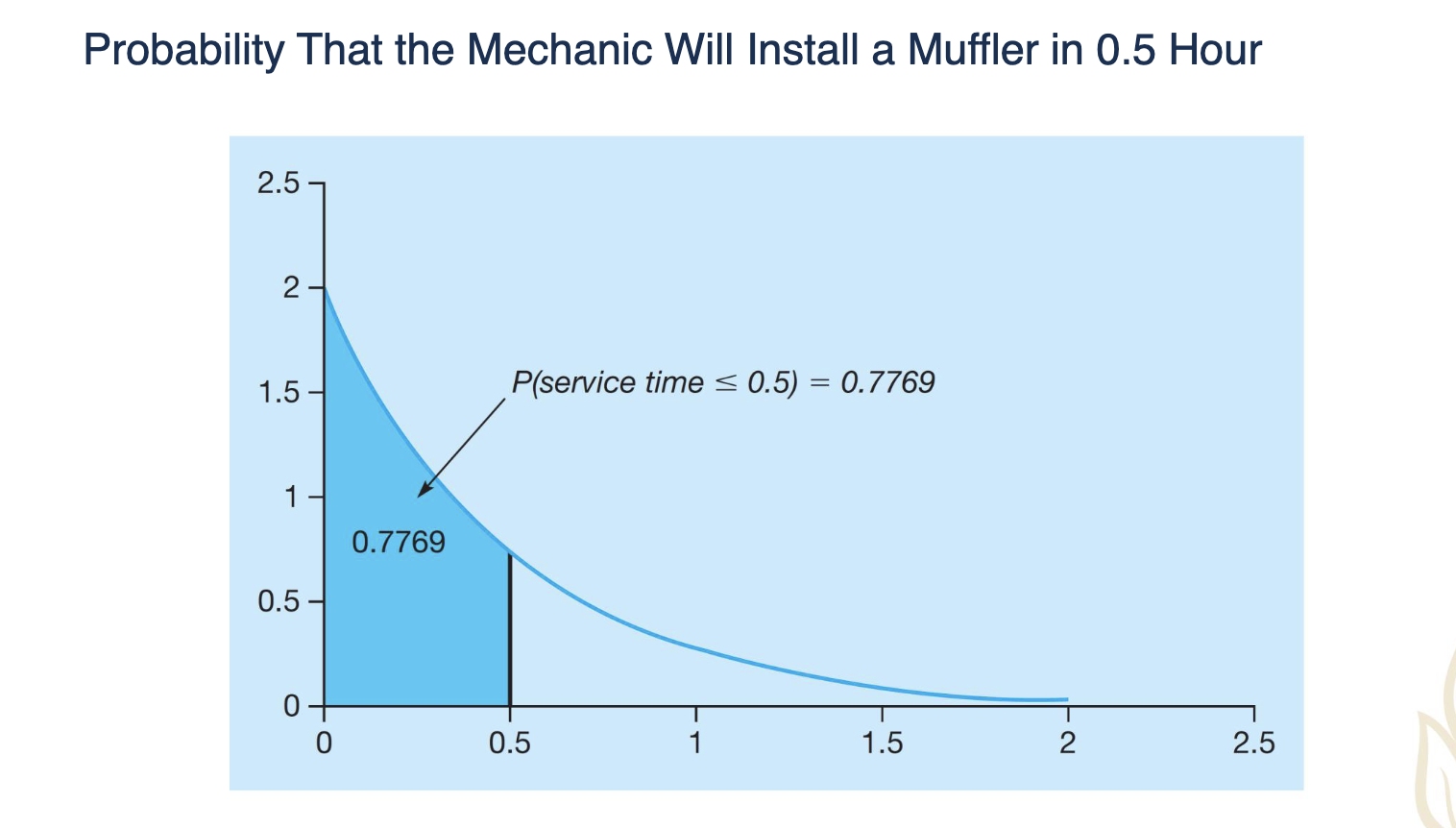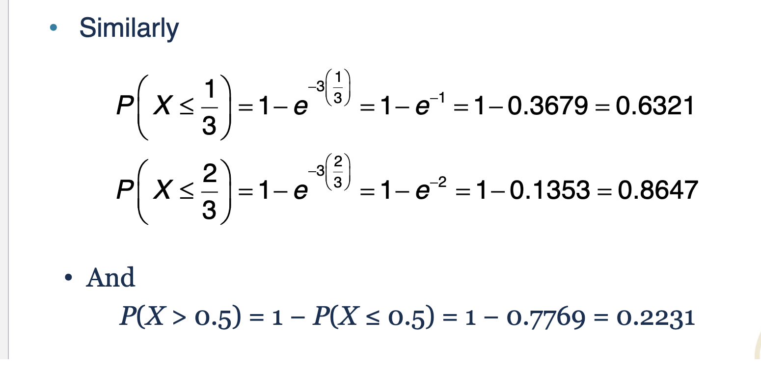 P(X ≤ 0.5) = 1 − e−3(0.5) = 1 − e −1.5 = 1 = 0.2231 = 0.7769