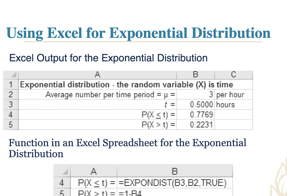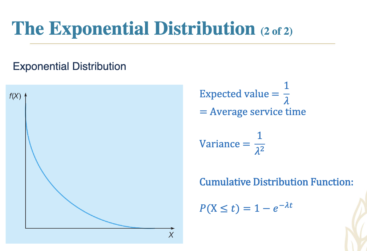 𝑃(X ≤ 𝑡) = 1 − 𝑒−𝜆𝑡This function describes the probability that a random variable X takes on a value less than or equal to t, illustrating the likelihood of service completion by time t.
