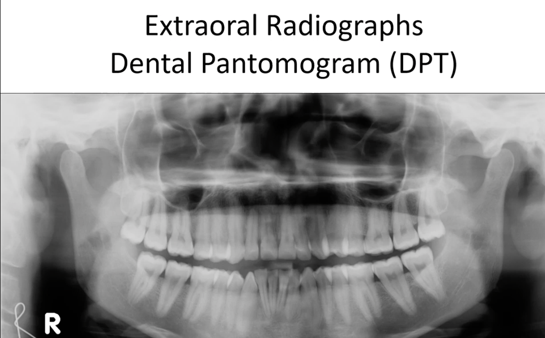 DPT- show full mandible and maxilla, roots, crowns can give good assessment of dentition