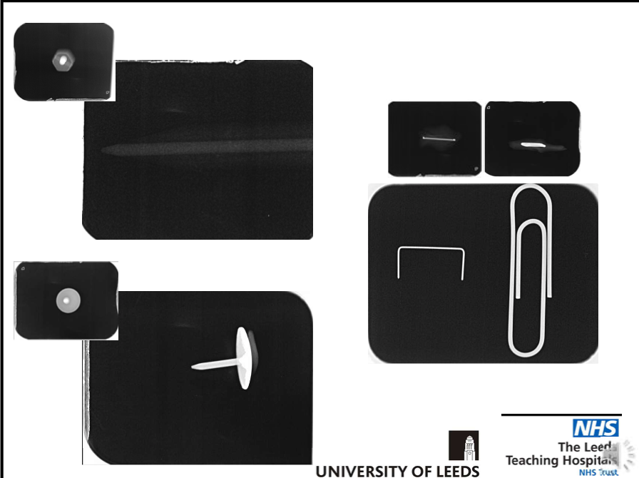 • Grey shadows represent areas where the X-ray beam has been stopped to a varying degree.