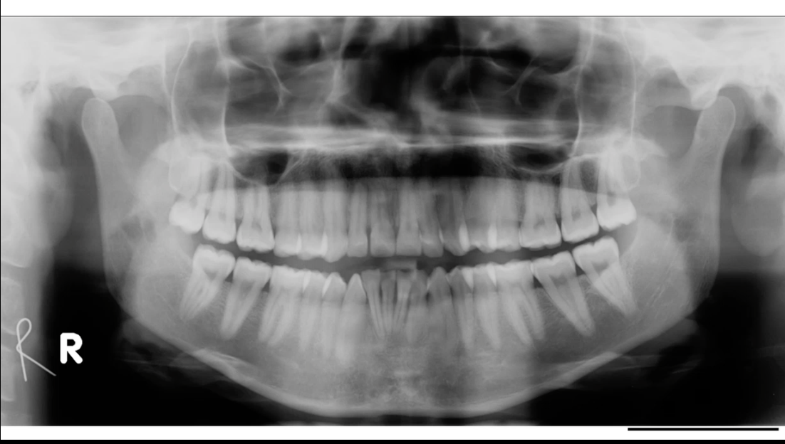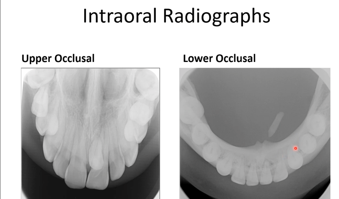 On the lower occlusal image you can see a submandibular stone- in salivary glands preventing saliva production- had this been a panoramic or periapical image, you wouldn’t be able to tell the stone is lingual to the bone