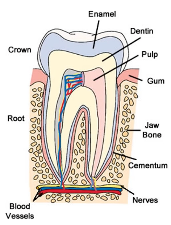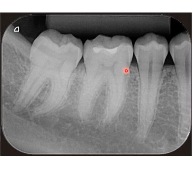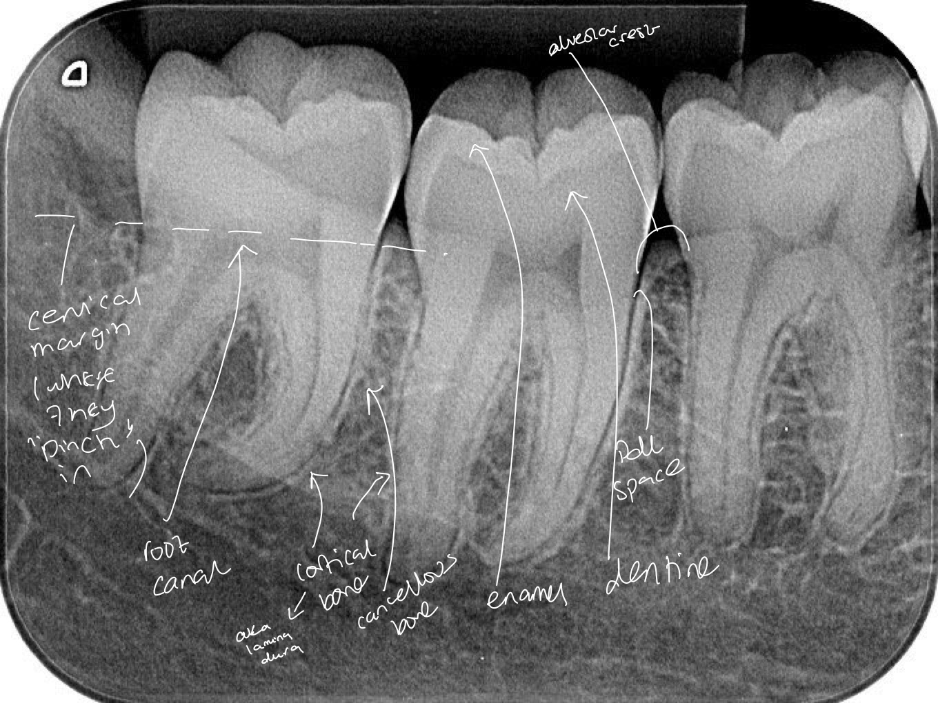 Root canal- soft tissue compared to enamel- doesn’t attenuate x rays as much- hence radiolucent(black) appearance