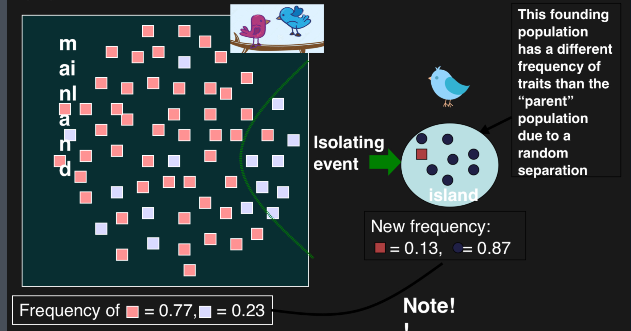 The founder effect: Rare individuals (and the genes they carry) become prevalent due to disproportionate frequencies in an initial breeding population