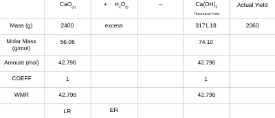“Slaked lime,” Ca(OH)2, is produced when water reacts with “quick lime,” CaO. If you start with 2 400 g of quick lime, add excess water, and produce 2 060 g of slaked lime, what is the percent yield of the reaction?