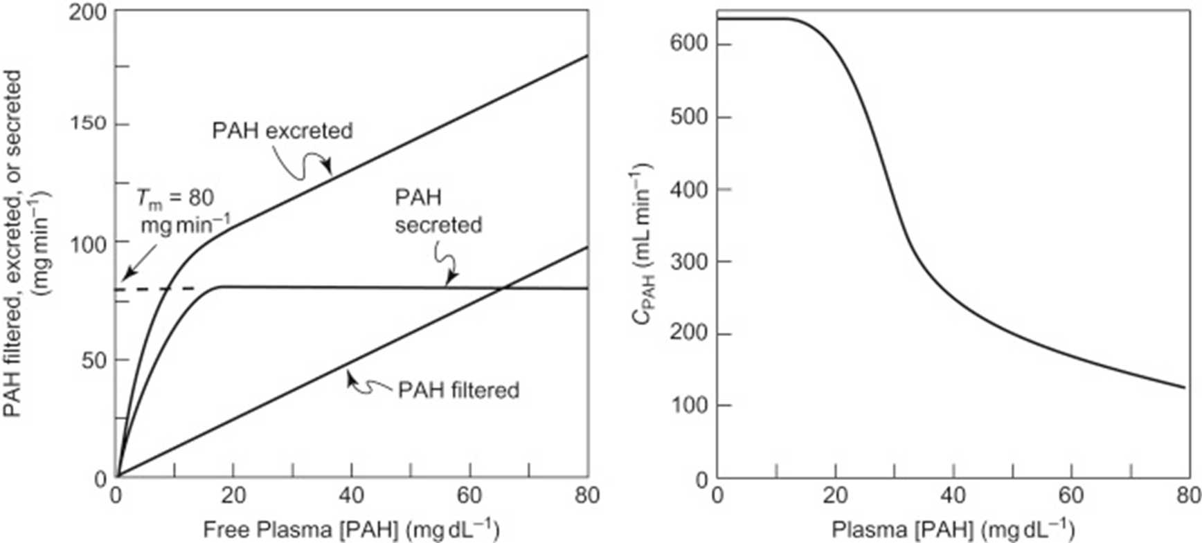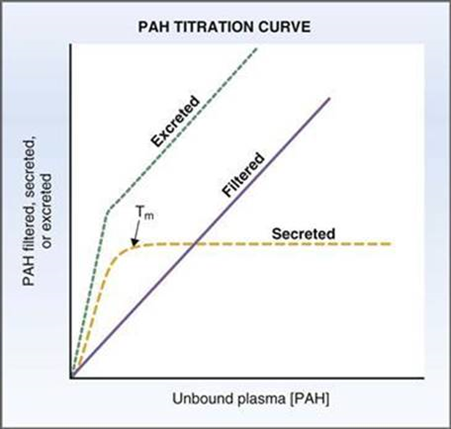 when transport max is reached = saturation = no more secretion and its excreted linearly w filtered load