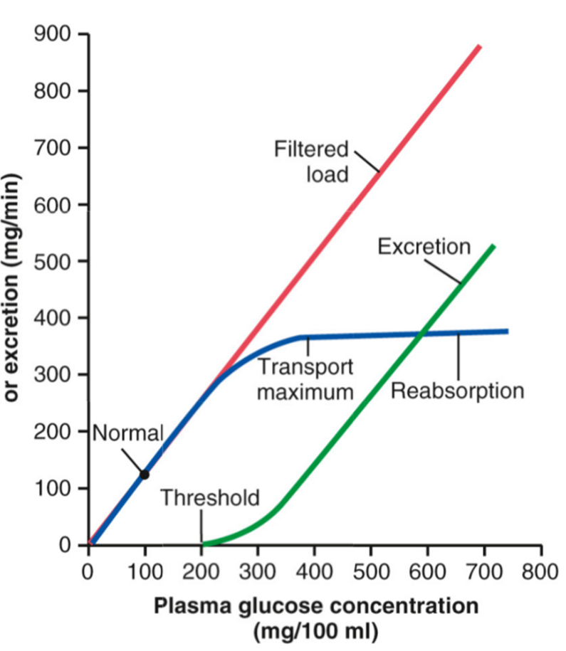 excess glucose youll reach trans max, and cannot reabsorb anymore glucose so its excreted in the urine (not good)