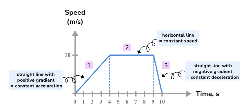 Horizontal line - (above x axis) Gradient = 0 → No change in acceleration (moving at a steady pace)