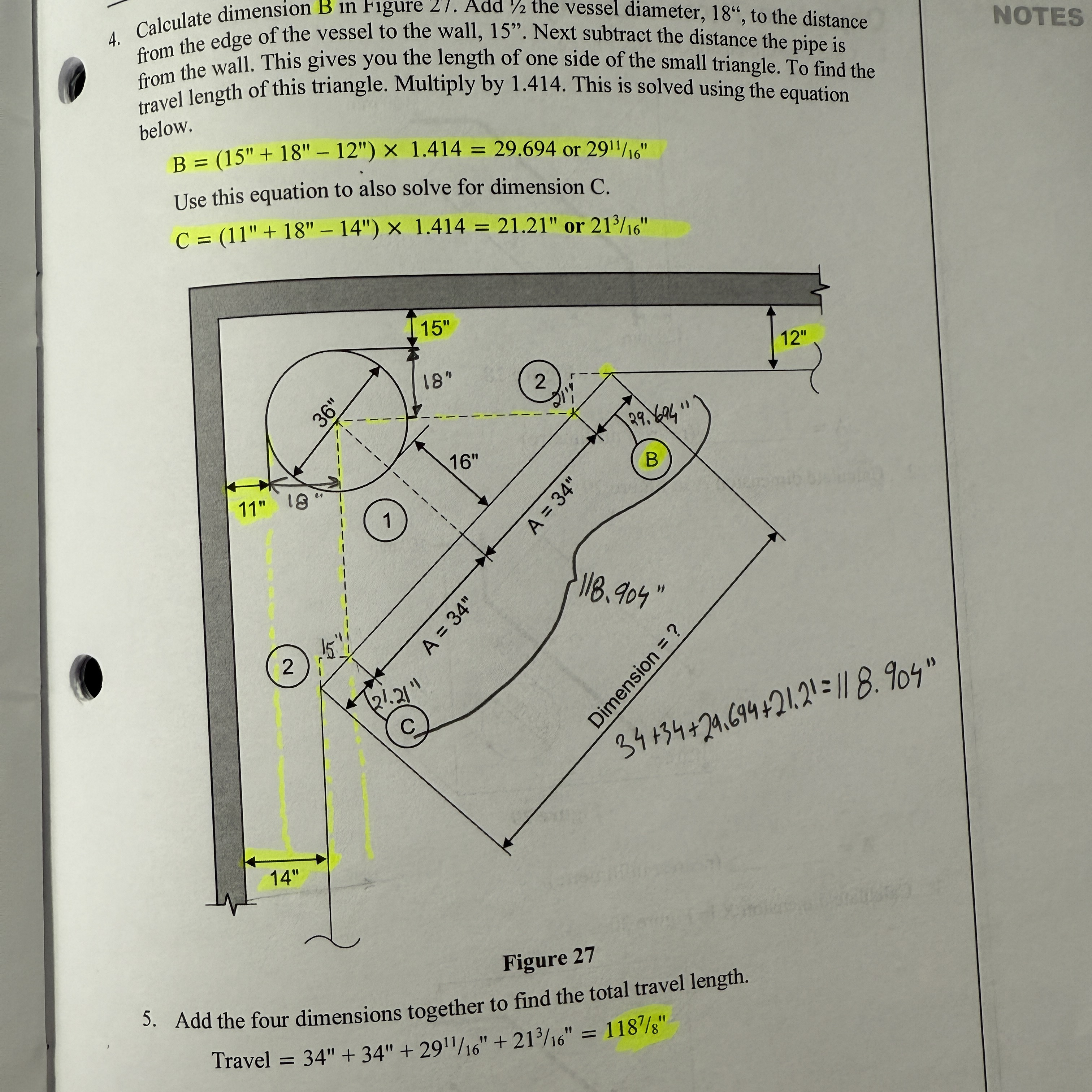 Travel dimension: center to center distance of the 45 deg fittings. This is the hypotenuse but if you were to cut, you need to substract the fitting allowance after calculating.