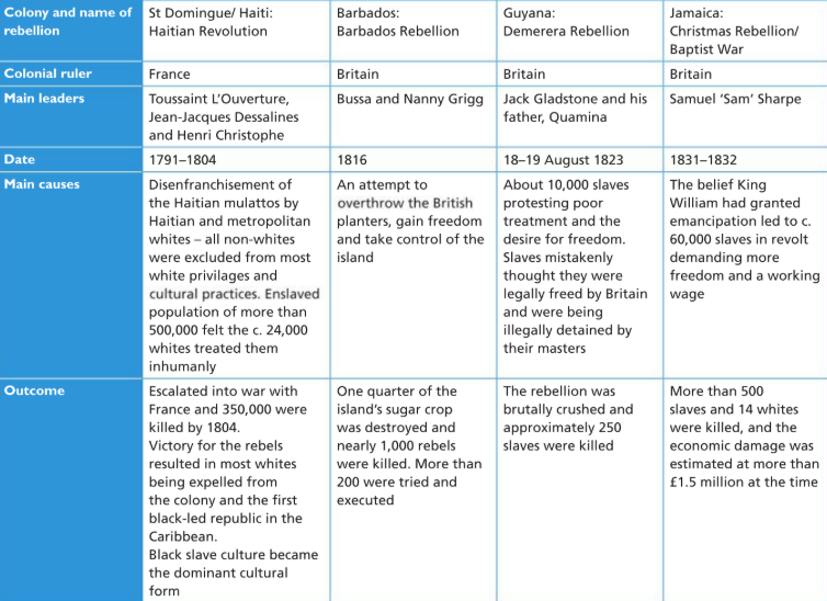 Africans were emancipated in the British Caribbean in 1838, in the French Caribbean in 1848 and at various dates in the Spanish Caribbean.