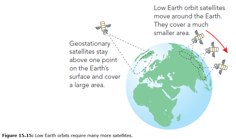 Low Earth Orbit (LEO): 2000 km, orbit ~2 hours, fast communication, need many satellites, less data per satellite