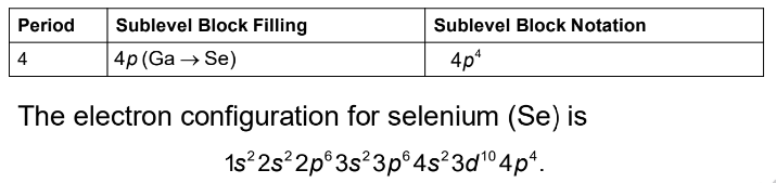 Complete the configuration by counting the electrons in the last occupied sublevel block. Because Selenium is the fourth element in the 4p block, there are 4 electrons in the 4p sublevel