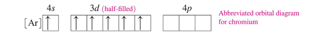 For Chromium (Cr), moving one of the 4s electrons to the 3d sublevel adds stability with a half-filled d subshell, and the resulting configuration is 4s^13d^5