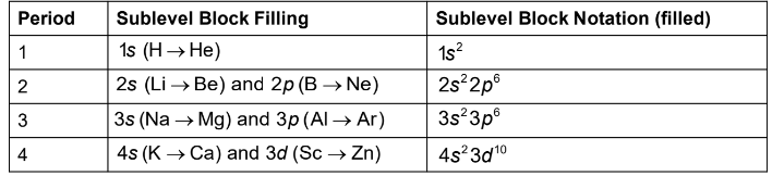 Write the filled sublevels in order, going across each period