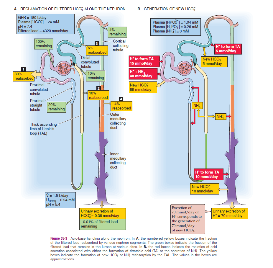 Tegelijkertijd genereert de nier dagelijks ongeveer 70 mmol nieuw bicarbonaat () om de verbruikte buffers in het bloedplasma weer aan te vullen.