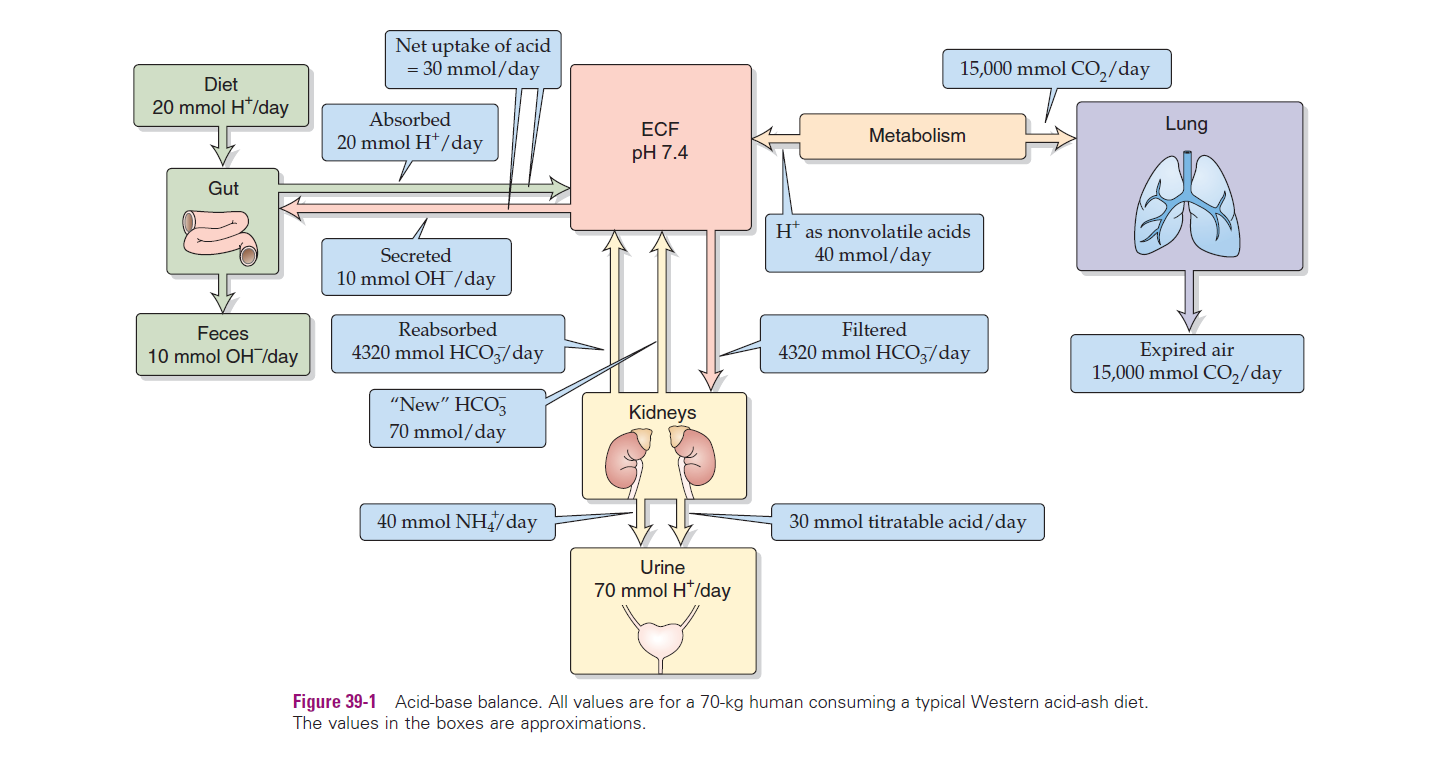 Indien de nieren 70 mmol vrije ionen zouden oplossen in 1,5 liter water, zou dit een extreem lage en weefselbeschadigende pH van ongeveer 1.3 opleveren.