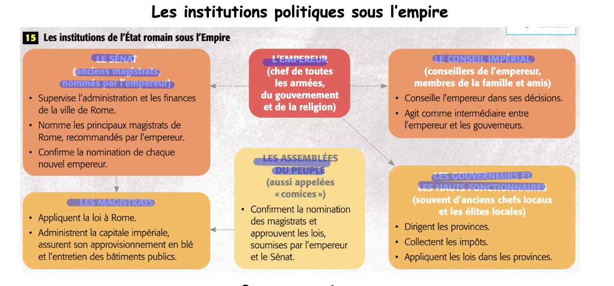 L'empereur gouverne avec l'aide du Sénat et des magistrats. L'empereur détient les principaux pouvoirs.