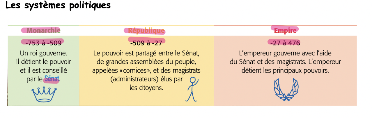 Le pouvoir est partagé entre le Sénat, de grandes assemblées du peuple, appelées «comices», et des magistrats (administrateurs) élus par les citoyens.