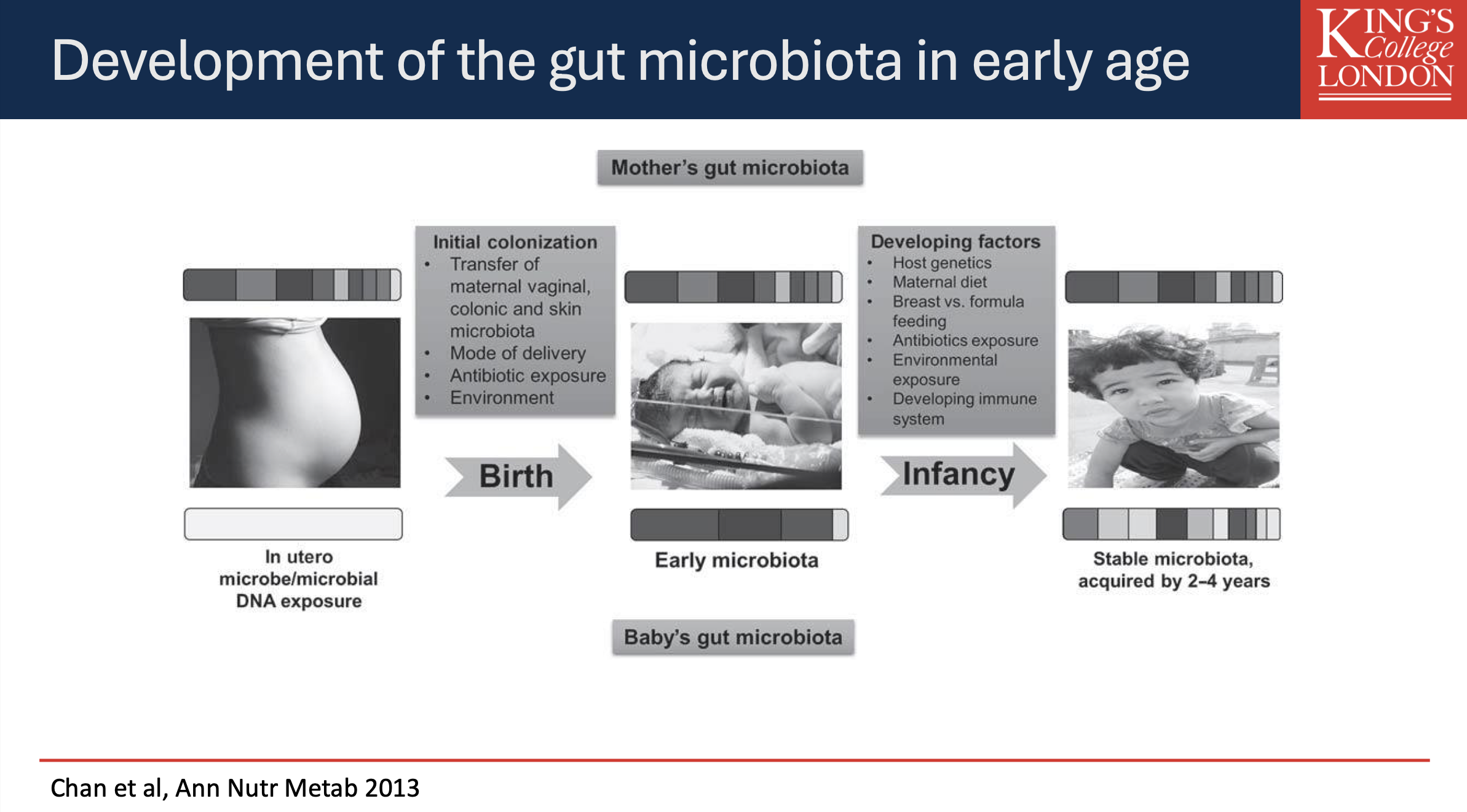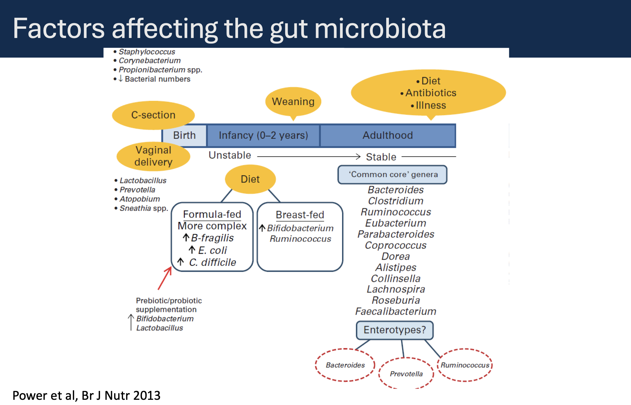 Birth | Mode of delivery (Vaginal vs C-section) | Vaginal: beneficial Lactobacillus, Bifidobacterium; C-section: skin/hospital microbes |