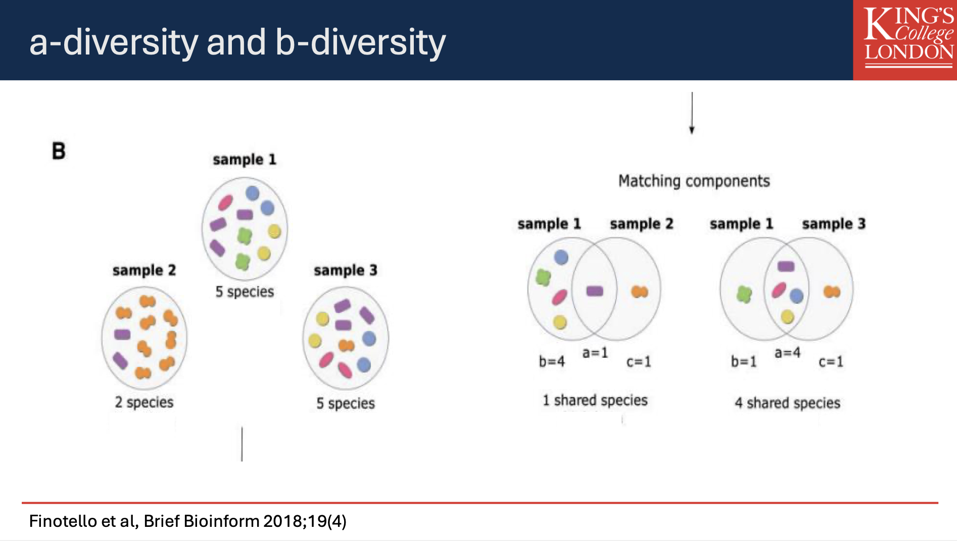 Beta Diversity: Compares two samples and their gut microbiota composition. This is useful to assess impact of fibre in a disease.