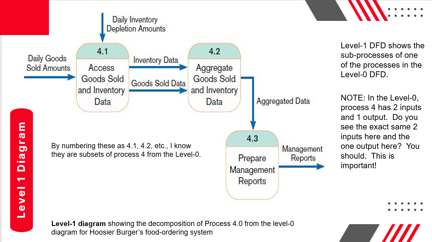 Shows decomposition of processes in Level-0 DFD. Number if input and output for a level 1 DFD must match the number of inputs and outputs in the level 0 process it represents.