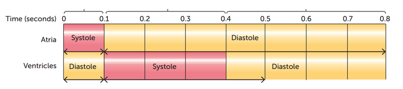 Chambers | Atrium contracts Ventricle relax | Atrium relax Ventricle contracts | Atrium relaxed Ventricle relaxed |