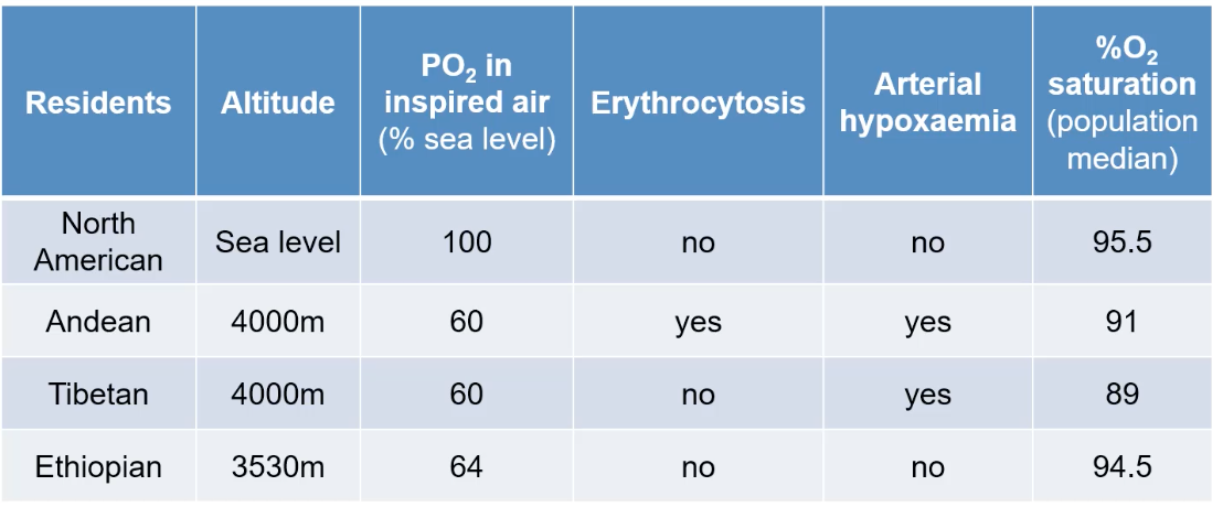 Andean Highlanders (e.g., 4000m): Typically show marked erythrocytosis (high red blood cell count) and may still experience some arterial hypoxemia, with a median O2 saturation around 91%.