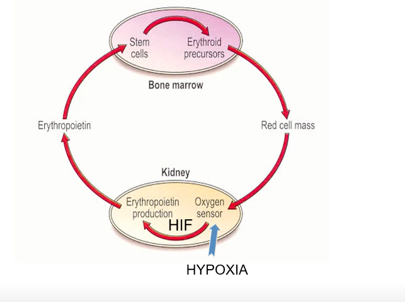 Erythropoiesis: Hypoxia stimulates the kidneys to release the hormone erythropoietin (EPO).