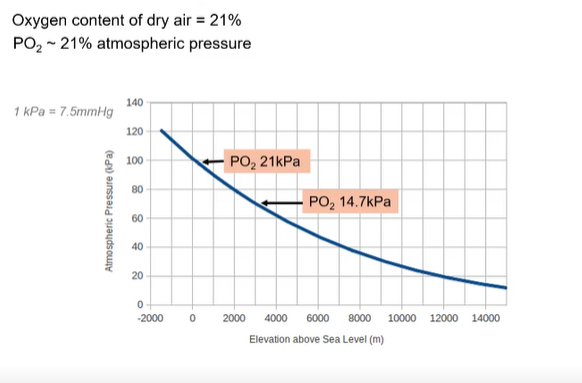 ~3000m: Atmospheric pressure ~70 kPa, PO2 ~14.7 kPa.