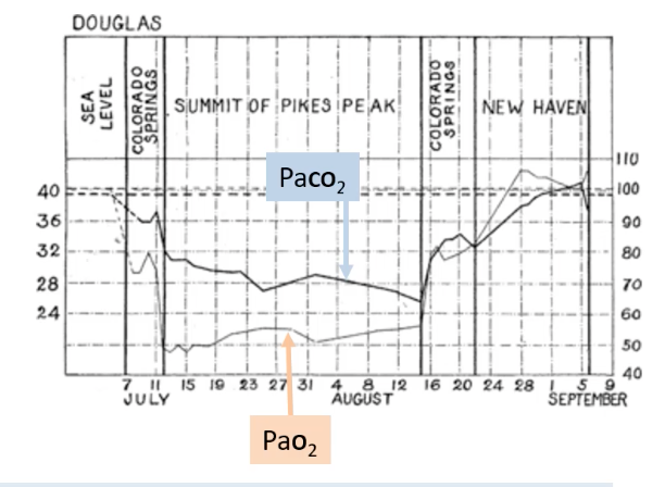 Historical research, like the Anglo-American Pikes Peak Expedition, demonstrated these changes. Over weeks at high altitude (Summit of Pikes Peak), PaCO2 gradually decreased (indicating sustained hyperventilation), while PaO2 increased from its initial nadir.