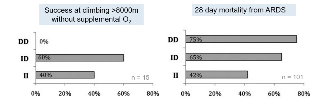 Individuals with the II genotype (homozygous for the insertion allele) are overrepresented among elite high-altitude climbers who ascend >8000m without supplemental O2. For example, in one study of 15 such climbers, 40% had the II genotype and 60% the ID genotype, with 0% having the DD genotype.
